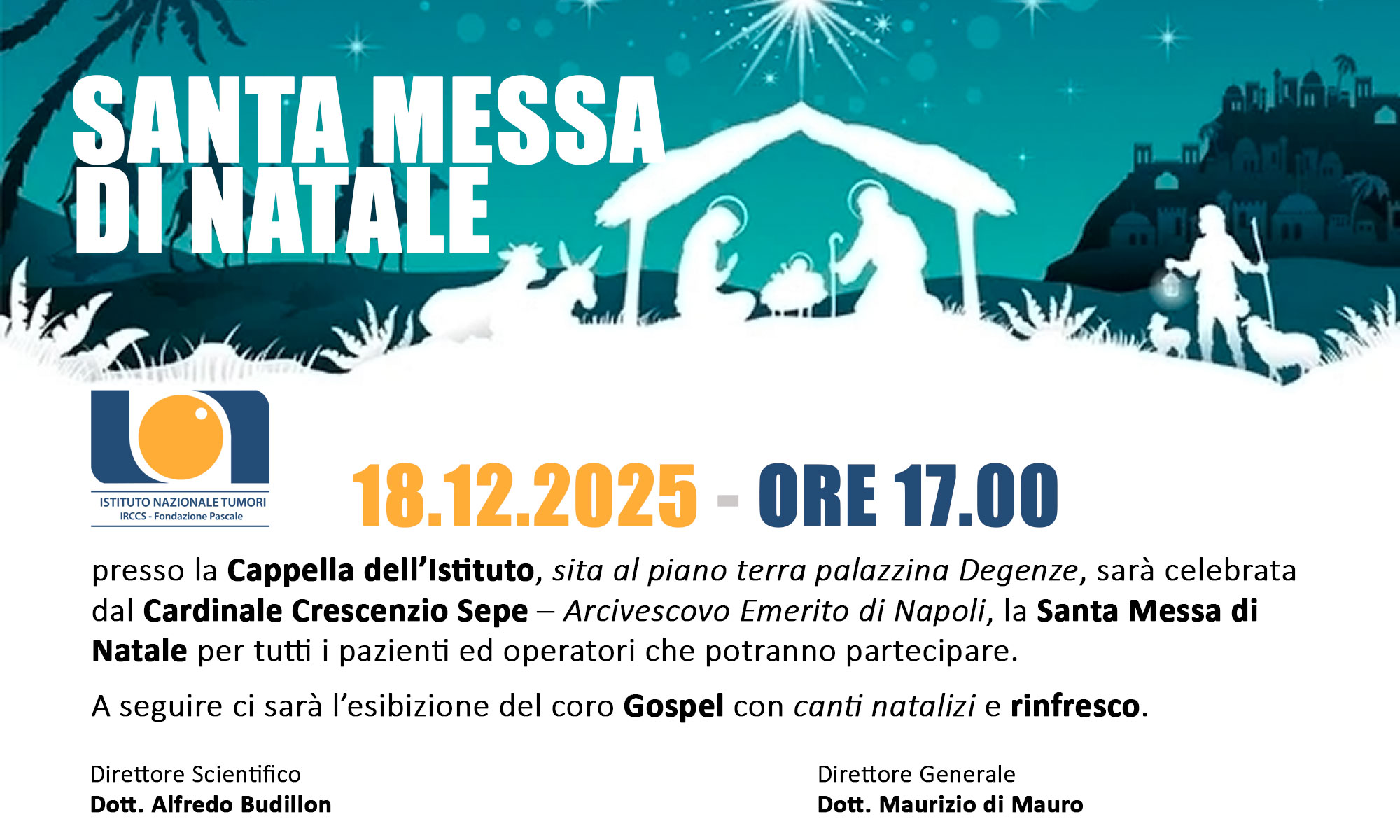 18.12.2025 – ore 17.00 Presso la Cappella dell’Istituto, sita al piano terra palazzina Degenze, sarà celebrata dal Cardinale Crescenzio Sepe – Arcivescovo Emerito di Napoli, la Santa Messa di Natale per tutti i pazienti ed operatori che potranno partecipare. A seguire ci sarà l’esibizione del coro Gospel con canti natalizi e rinfresco.